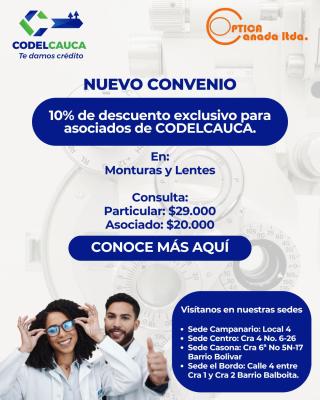 10% de descuento en monturas y lentes, además, por ser asociado a Codelcauca, la consulta queda por un valor de $20.000